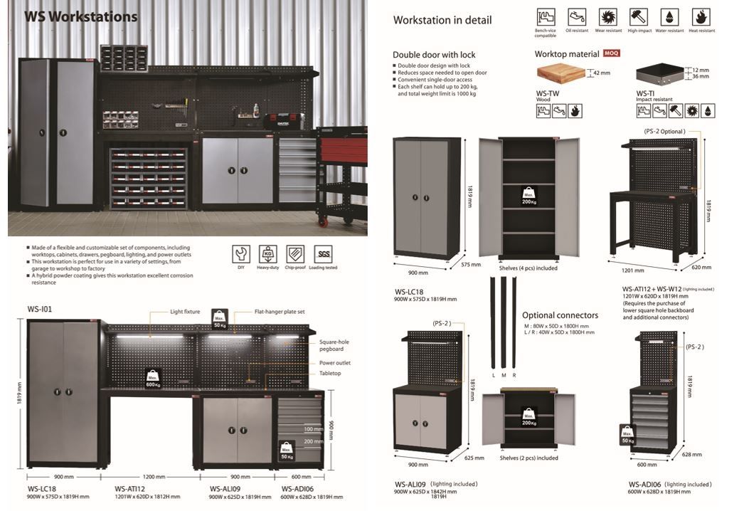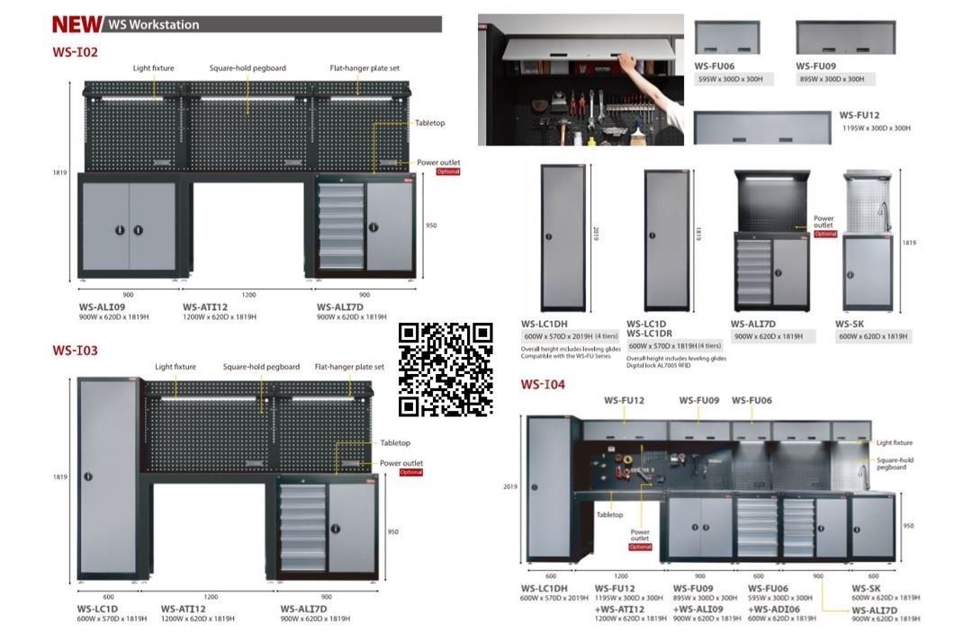 The series includes multiple configurations such as WS-I02, WS-I03, and WS-I04, each offering a blend of open work surfaces, secure storage cabinets, modular pegboards, and optional overhead fixtures. These configurations are engineered to provide seamless task flow and intuitive tool access, enabling workers to maintain productivity without interruption.
