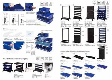 The HB Industrial Hanging Bin Series provides a versatile solution for organizing small parts, components, and tools. Made from high-grade polypropylene (PP), the bins are oil-resistant and impact-resistant, ensuring long-term durability in demanding industrial conditions.With a stackable and nestable design, the bins can be arranged horizontally or vertically, mounted on walls or pegboards, or integrated into mobile stands and carts. Optional accessories—including dividers, lids, and mobile frames—expand functionality and adaptability. The HB system is well suited for production lines, workbenches, and storage areas requiring frequent access and clear visual organization.