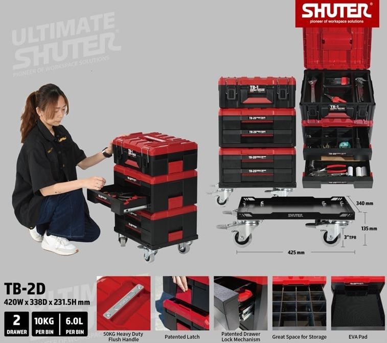 SHUTER TB-1 adalah kotak alat yang dapat ditumpuk secara kaku yang terbuat dari bahan ABS yang memberikan ketahanan terhadap benturan dan suhu yang lebih baik dalam kinerjanya. Juga dilengkapi dengan kunci paten di sisi kotak alat yang memungkinkan kotak alat SHUTER TB-1 atau TB-2D terkunci satu sama lain, sehingga memudahkan untuk menumpuk dan mengangkut beberapa kotak alat dengan efisien. SHUTER juga merancang sebuah kereta dorong baru yang dapat menampung beberapa kotak alat untuk kemudahan manuver dan membantu Anda membawa alat-alat dan aksesori ke tempat yang Anda butuhkan. SHUTER TB-1 adalah kotak perkakas berukuran 16,5" dengan kapasitas beban 30kg, dan struktur kotak ini dapat menopang hingga 100kg untuk aplikasi berat. Memiliki kapasitas 15L untuk menyimpan lebih banyak alat dan menawarkan solusi penyimpanan yang lebih fleksibel dengan aksesori ekspansi yang luar biasa, termasuk meja, tas gantung samping, dan pengatur penyimpanan untuk memaksimalkan efisiensi Anda.