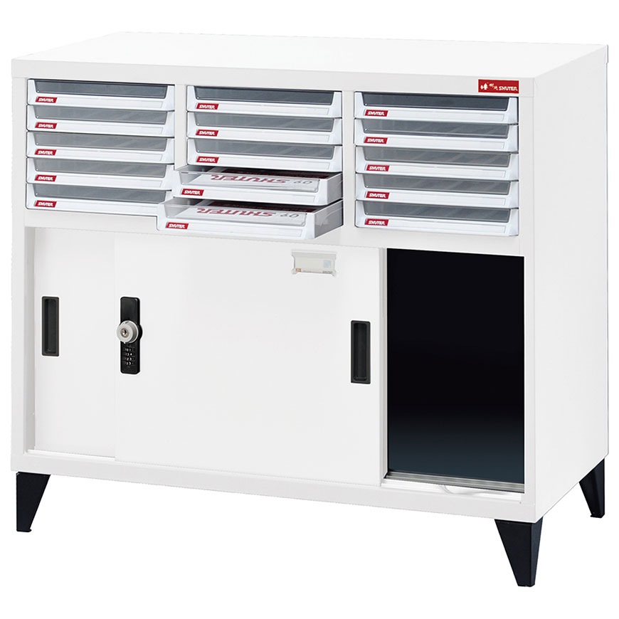 Tủ lưu trữ tài liệu đa năng này có cửa thép có thể khóa, 15 ngăn kéo tài liệu trong suốt và chân thép hấp dẫn. Cửa trượt nhẹ nhàng có thể được khóa bằng khóa số điện tử.